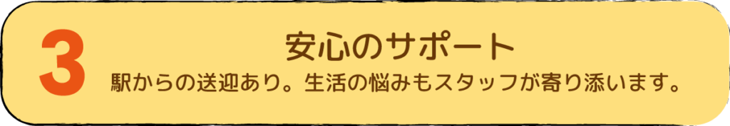 「ただ作業をする場所」ではなく、「ここにいたい」「また来たい」と思っていただけるような、「温かく前向きな場所」そんな場所を目指して、日々の困りごとや将来の不安など、いつでもスタッフに悩みを相談できる体制を整えています。また、必要に応じた送迎サービスもご用意しております。